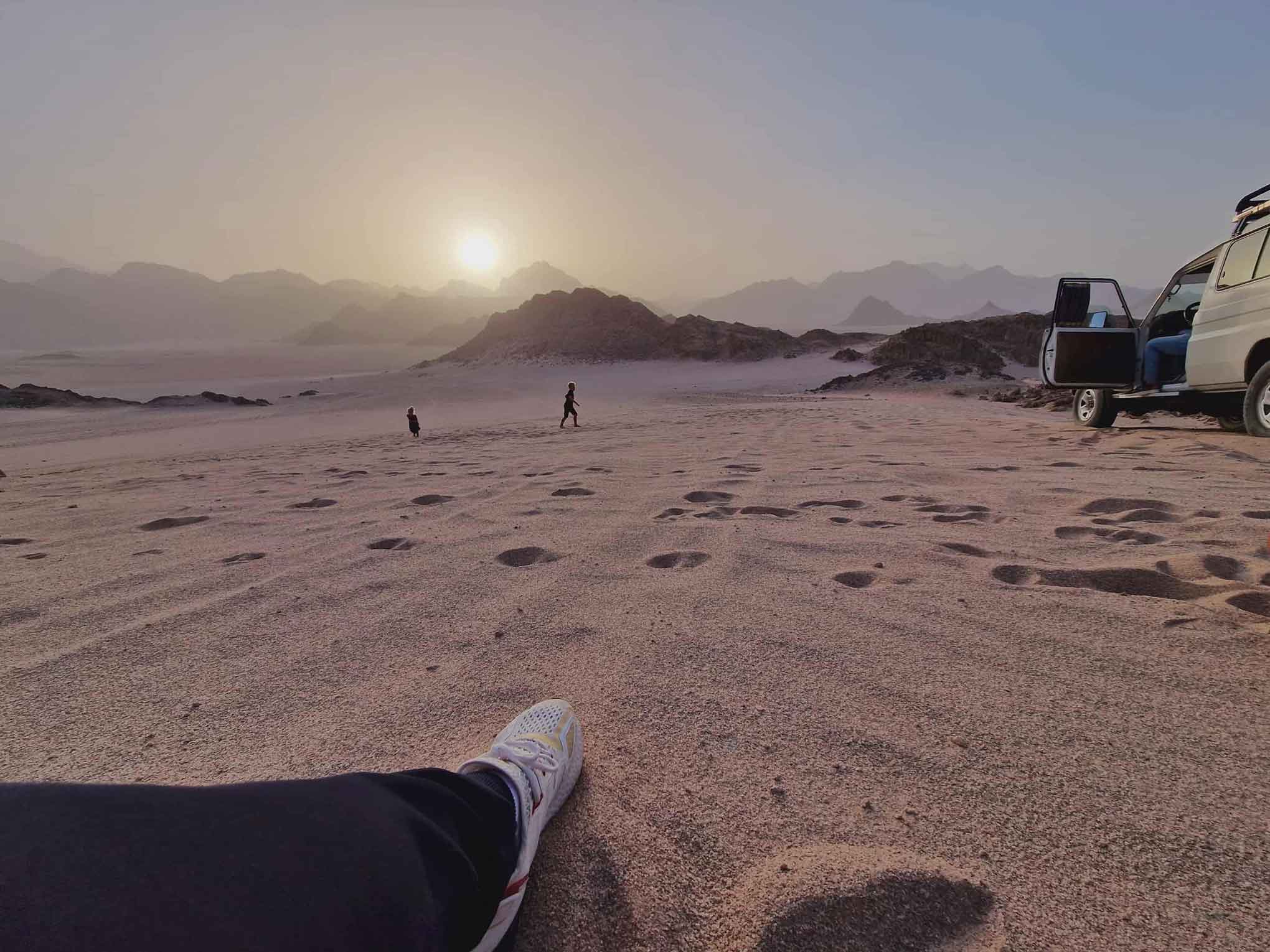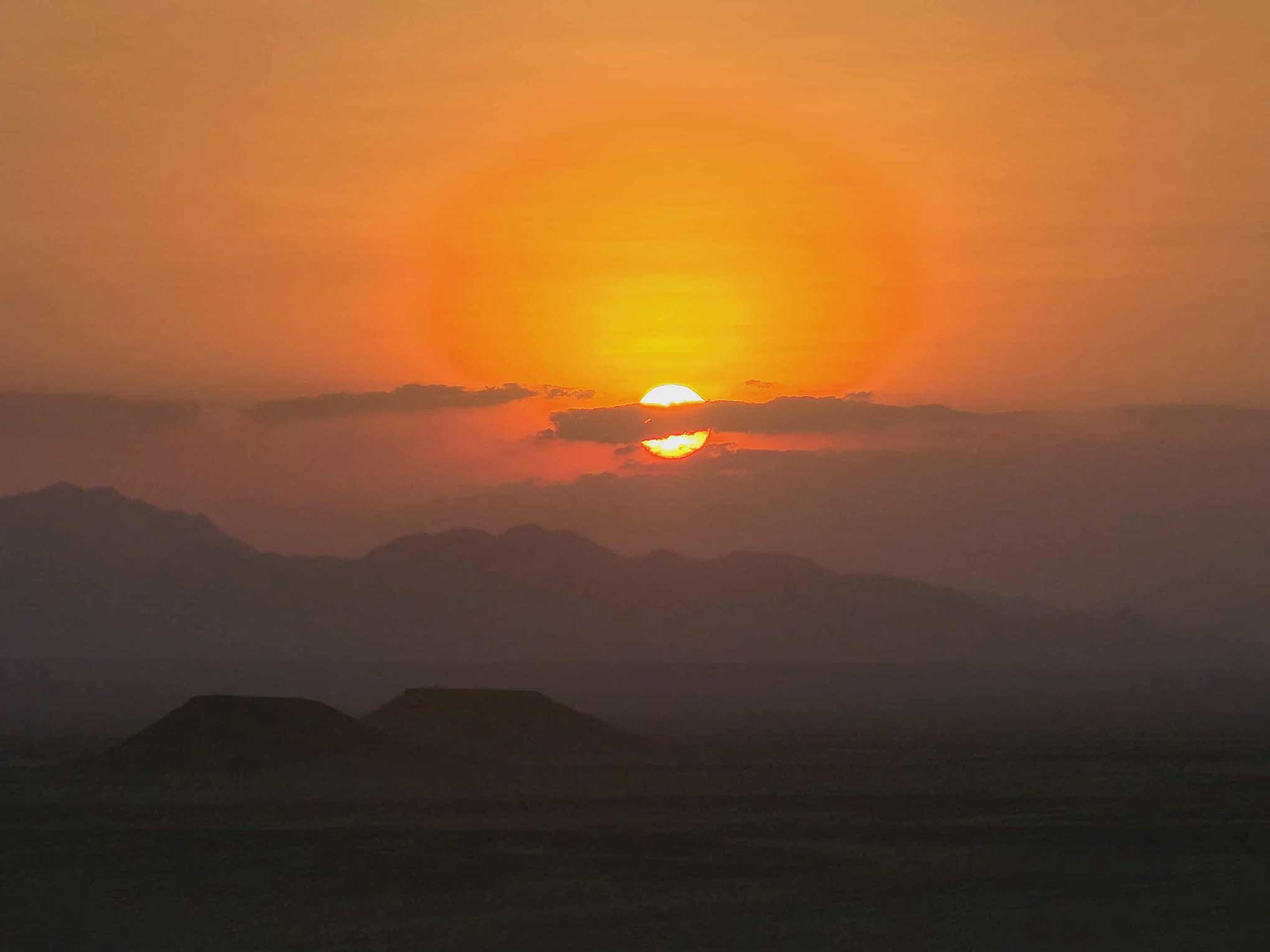 Erleben Sie den magischen Moment, wenn die Sonne langsam hinter den Bergen verschwindet und die Wüste in goldenes Licht taucht.