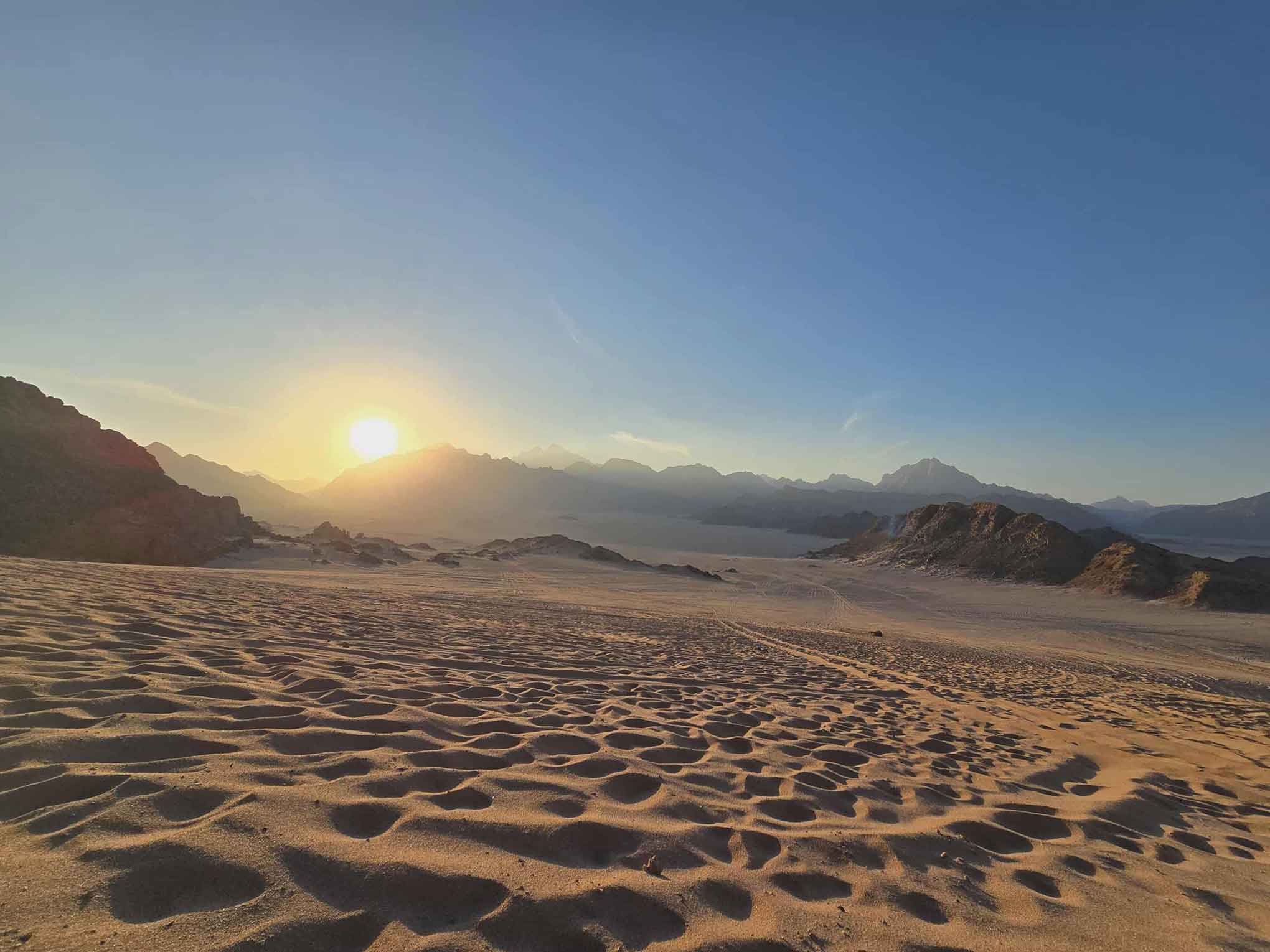 Unterwegs erleben Sie beeindruckende Panoramen der Rotmeer-Berge und genießen den Sonnenuntergang von einem atemberaubenden Aussichtspunkt aus.Nach Einbruch der Dunkelheit erwartet Sie ein traditionelles Abendessen bei Kerzenlicht – inmitten der stillen Weite der Wüste.